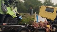 Jalan Lintas Prabumulih-Palembang Laka Adu Kambing Truk Fuso Vs Mobil Truk Box Muatan Air Mineral Telan Korban